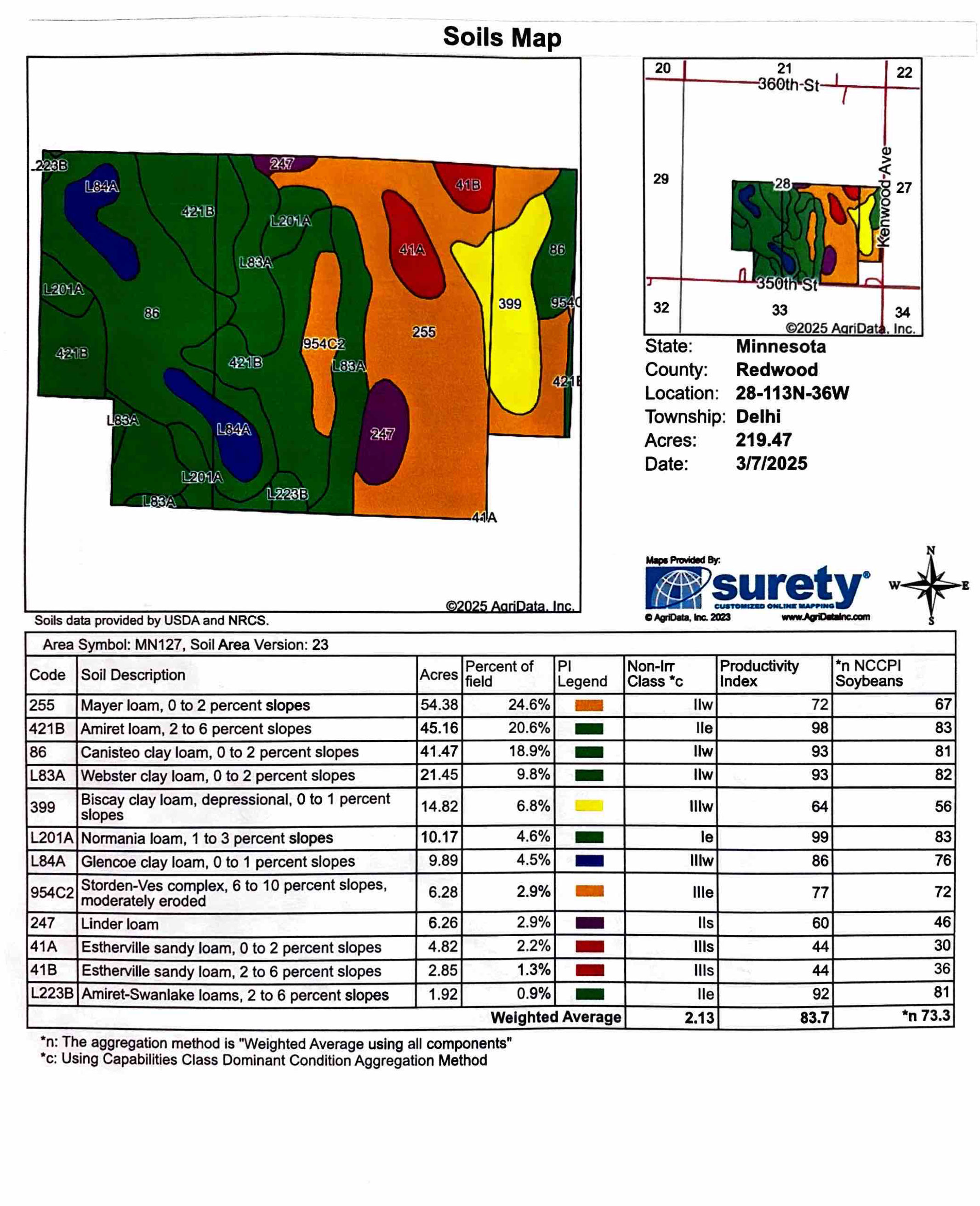 Legal Description: Redwood Co. Parcel's:# 52-028-3060; 52-028-4020; 52-028; 52-028-4060; Exact Legal description to govern to be provided by Seller @ Closing. Tracts are located in Section 28, T114N, R36W; Delhi Township; (219.85 Deeded Acres/219.47 Tillable Acres).