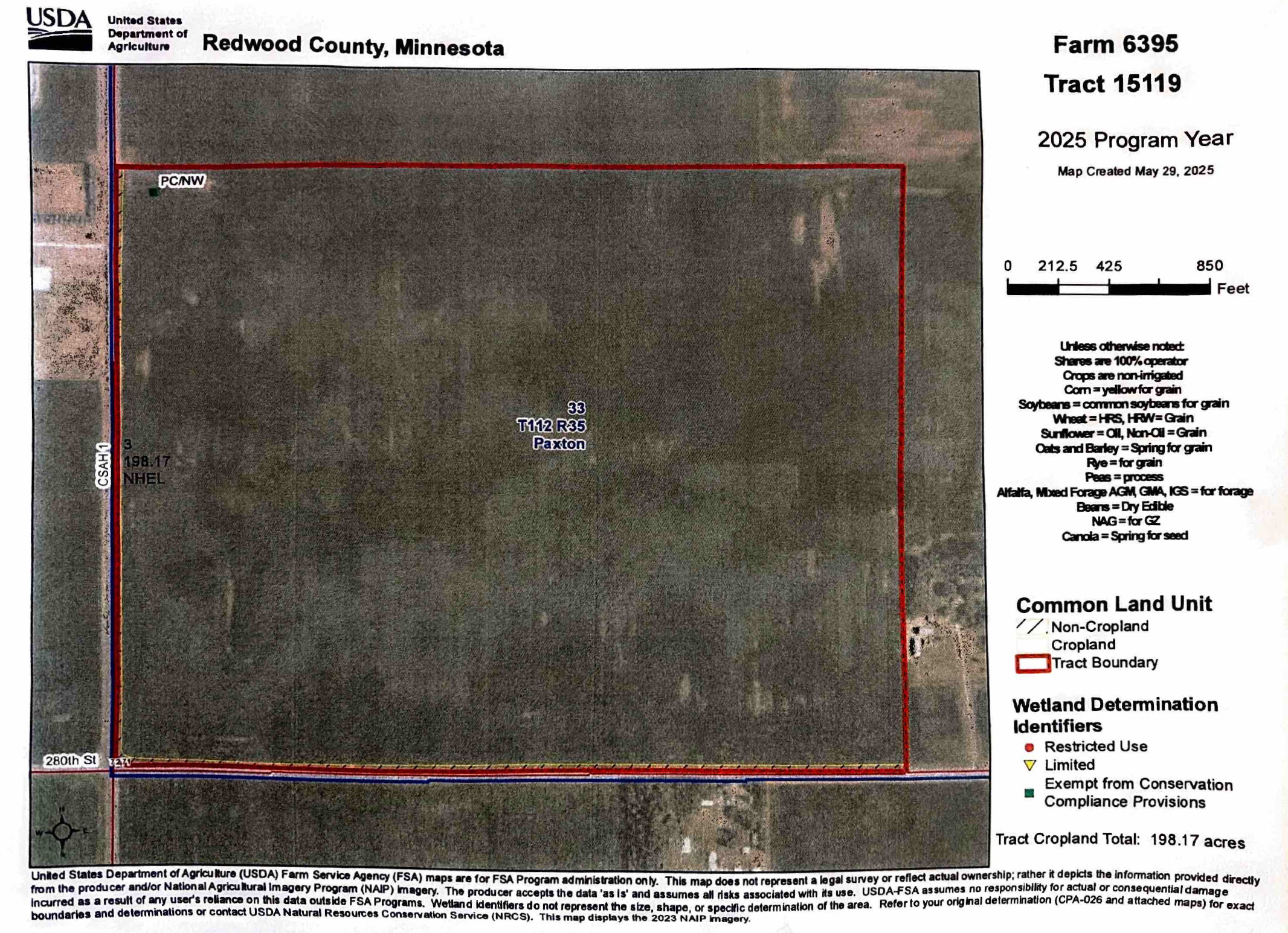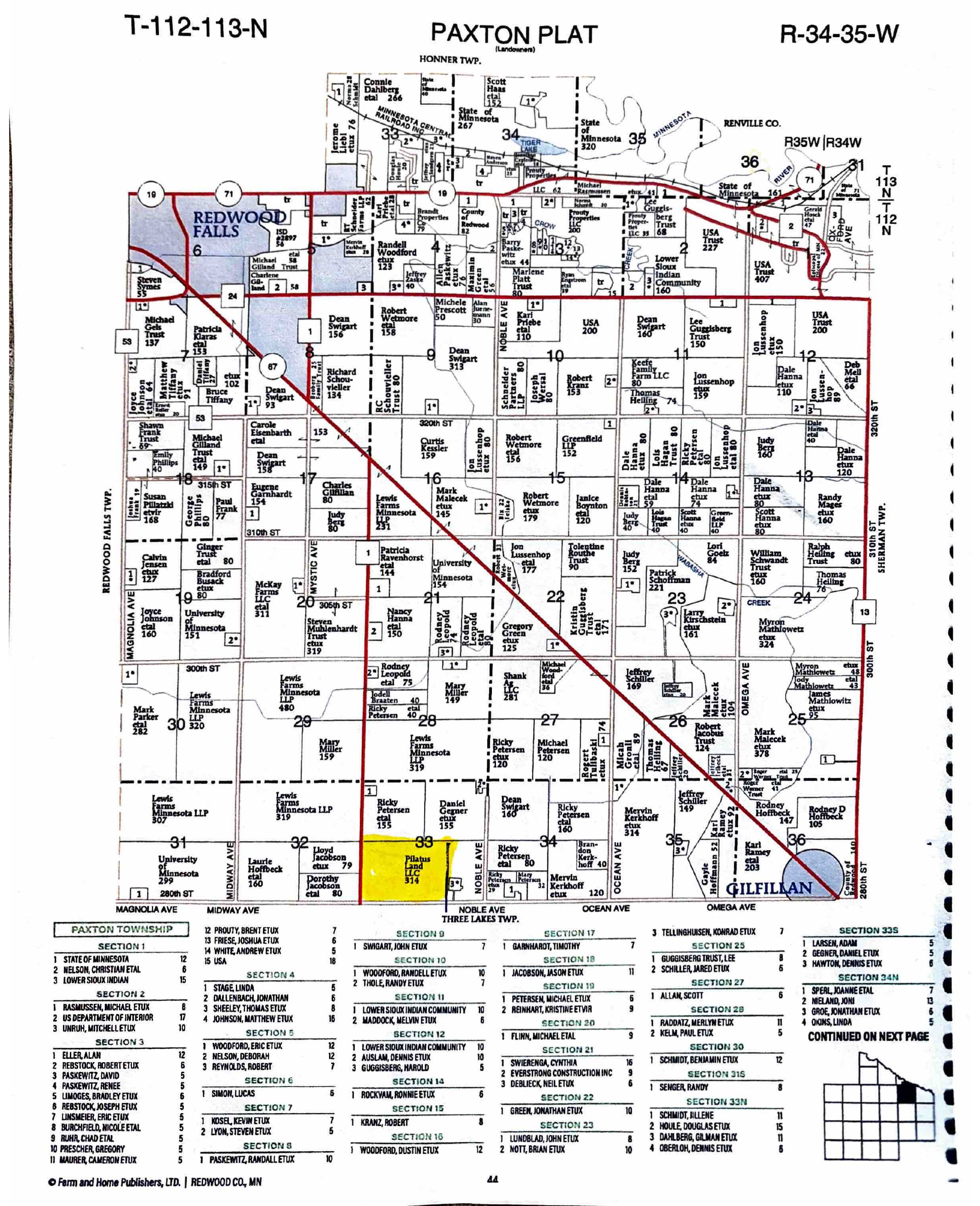Legal Description: Redwood Co. Parcel's:# 62-03303020; Exact Legal description to govern to be provided by Seller @ Closing. Tracts are located in Section 33, T112N, R35W; Paxton Township; (200.30 Deeded Acres/198.17 Tillable Acres).